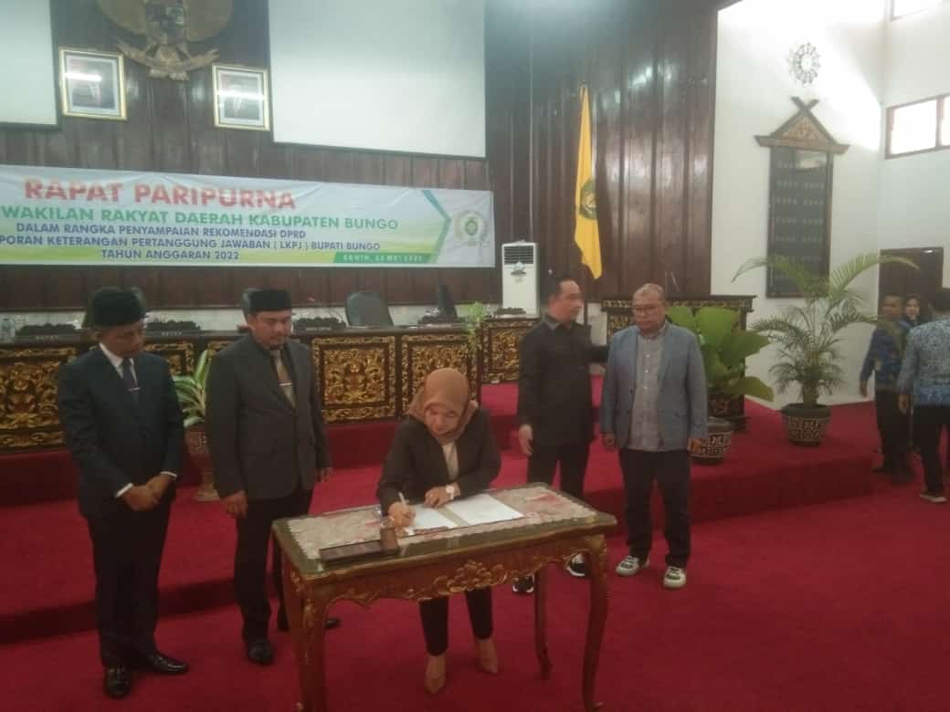 BUNGO – Radarpublik.id – Dewan perwakilan rakyat daerah (DPRD) Kabupaten Bungo menggelar rapat paripurna penyampaian rekomendasi DPRD terhadap laporan keterangan pertanggungjawaban (LKPJ) Bupati Bungo tahun anggaran 2022. 22/5/2023