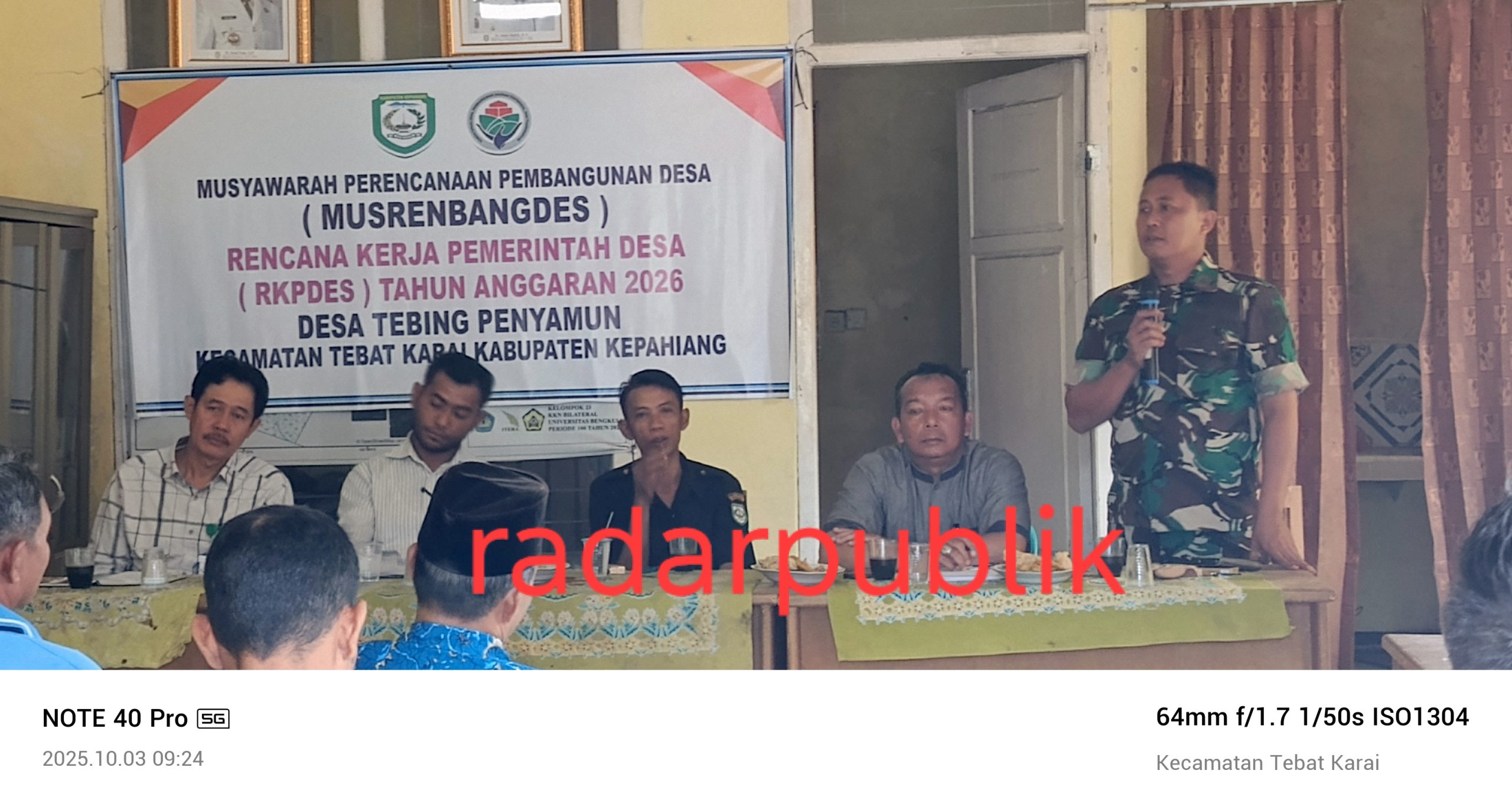 Kepahiang, radarpublik.id – Pada tanggal 3 Oktober 2025, Pemerintah Desa Tebing Penyamun, Kecamatan Tebat Karai, Kabupaten Kepahiang, mengadakan musyawarah desa untuk menetapkan Rencana Kerja Pemerintah Desa (RKPDes) tahun anggaran 2026. Acara ini berlangsung di balai desa dan dihadiri oleh berbagai elemen masyarakat.